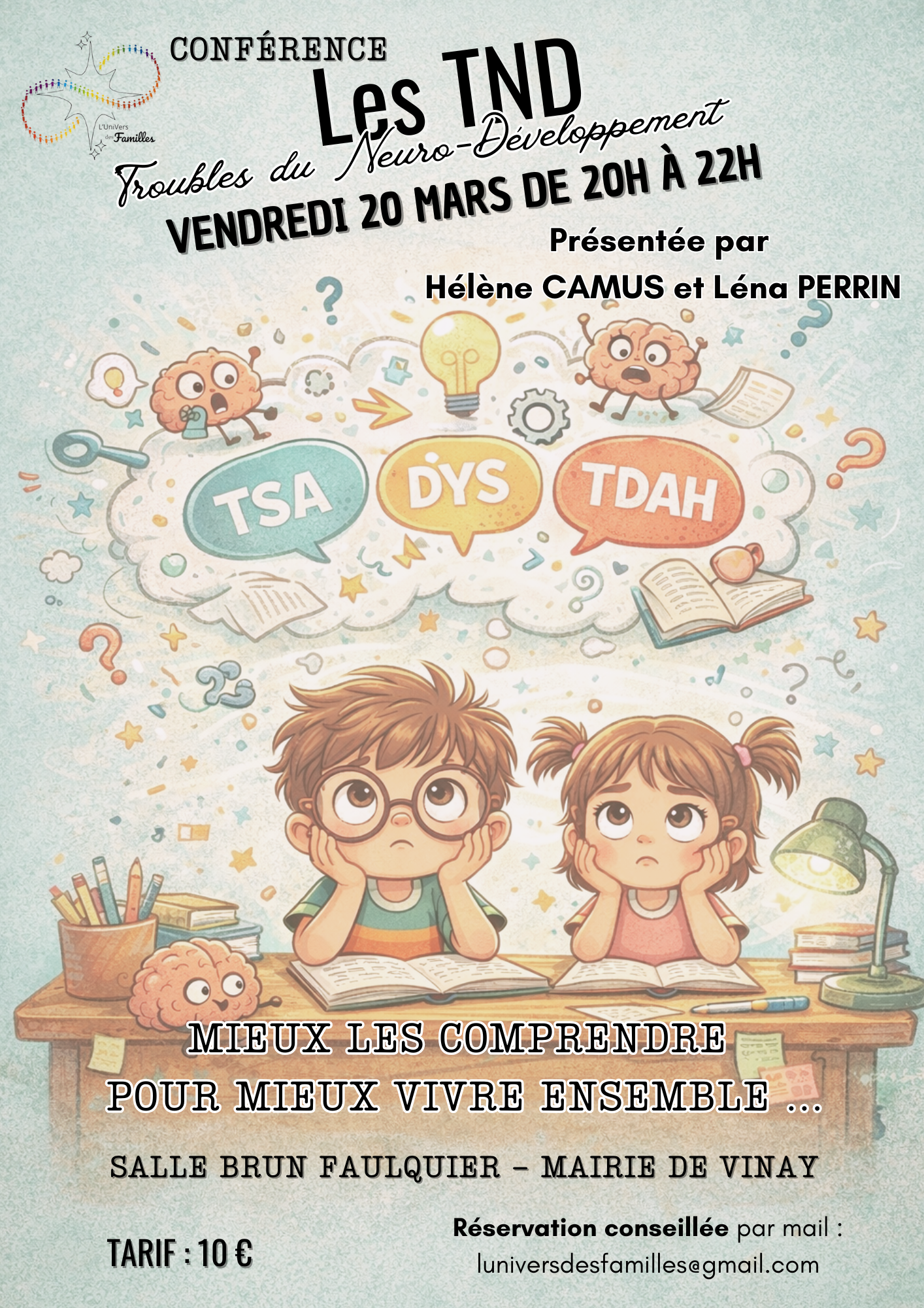 Rencontre et échanges pour comprendre, accueillir et accompagner les personnes concernées par les Troubles du Neuro-Développement. Conférence proposée par Hélène CAMUS et Léna PERRIN et organisée par l'association l'UniVers des Familles